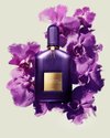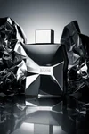 YSL Balck Opium Fragrance in a dark environment. Crumpled lace fills the backlit background and there is a reflection like water in the foreground. Fragrance Still Life Photograph by London Based Still Life Photographer Andy Carson.