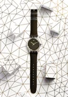 Black Swatch Watch floating on black thread lines. Still Life Photograph by London Based Still Life Photographer Andy Carson